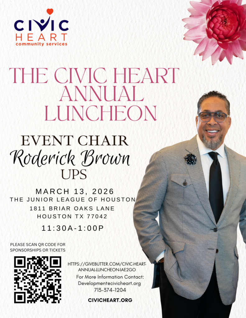 The Civic Heart Annual Luncheon is a signature fundraising and community engagement event supporting Civic Heart Community Services’ mission to empower individuals and families to build safer, healthier, and more stable lives. The 2026 luncheon will be held on March 13, 2026, from 11:30 AM to 1:00 PM at The Junior League of Houston, bringing together community leaders, corporate partners, and supporters dedicated to strengthening Houston-area communities.