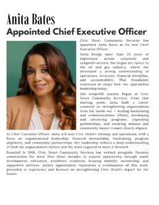 Houston, TX — Civic Heart Community Services announces the appointment of Anita Bates as its new Chief Executive Officer. With more than 25 years of experience spanning corporate and nonprofit sectors, Bates brings a strong foundation in operations, financial discipline, organizational structure, and accountability to the role.